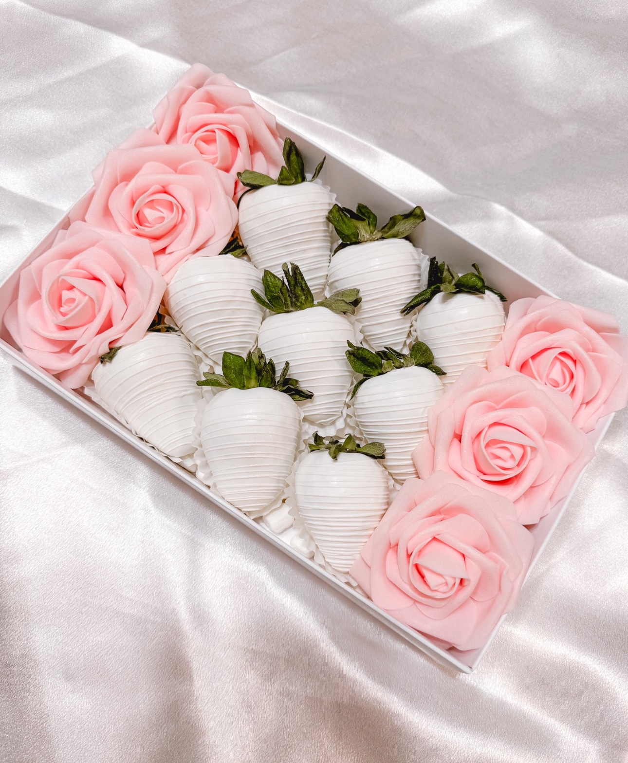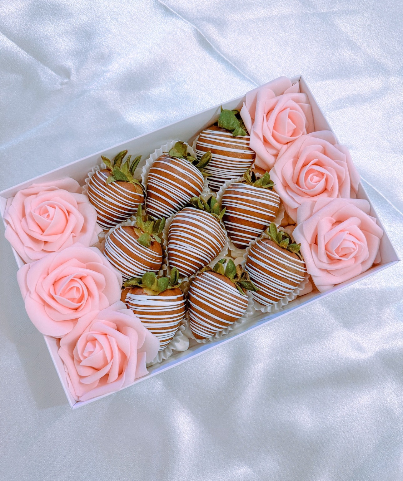 Discover bliss with nine chocolate-coated strawberries and six delicate artificial roses, a harmonious blend of sweetness and beauty.